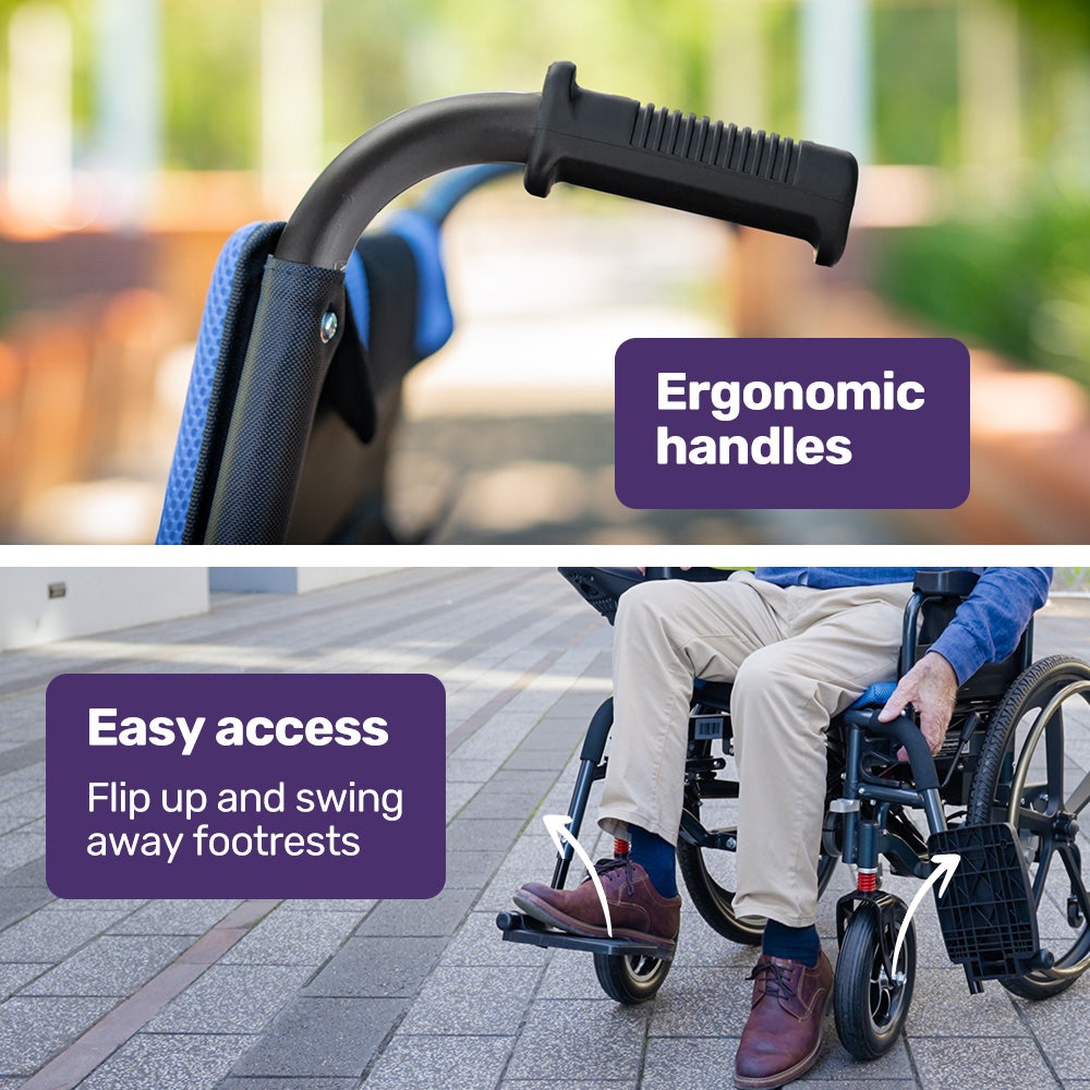 - Easy access and exit with flip-up armrests and fold-up foot rest