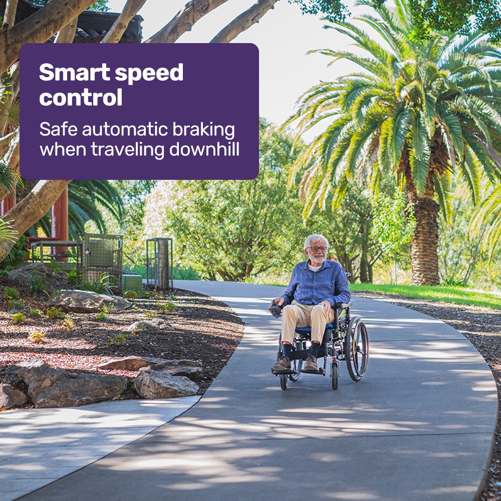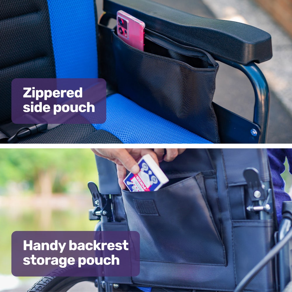 The large rear wheels glide smoothly over the bumps, and the tyres are puncture-proof and never require refilling with air! Theres also a hand rim which gives the option for it to be used as a manual wheelchair.