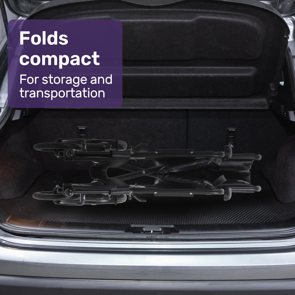 Thick 12-inch rear wheels ensure a smooth ride over bumps on a range of surfaces. Not only that, they also offer the practicality of not requiring to be refilled with air and will never experience a puncture! With a swift 2-second folding action, caregivers can easily transport this wheelchair wherever it's needed.
