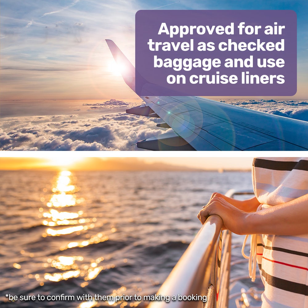 - 288Wh battery capacity is permitted on most Airlines and Cruise Liners (check with them prior to making a booking)